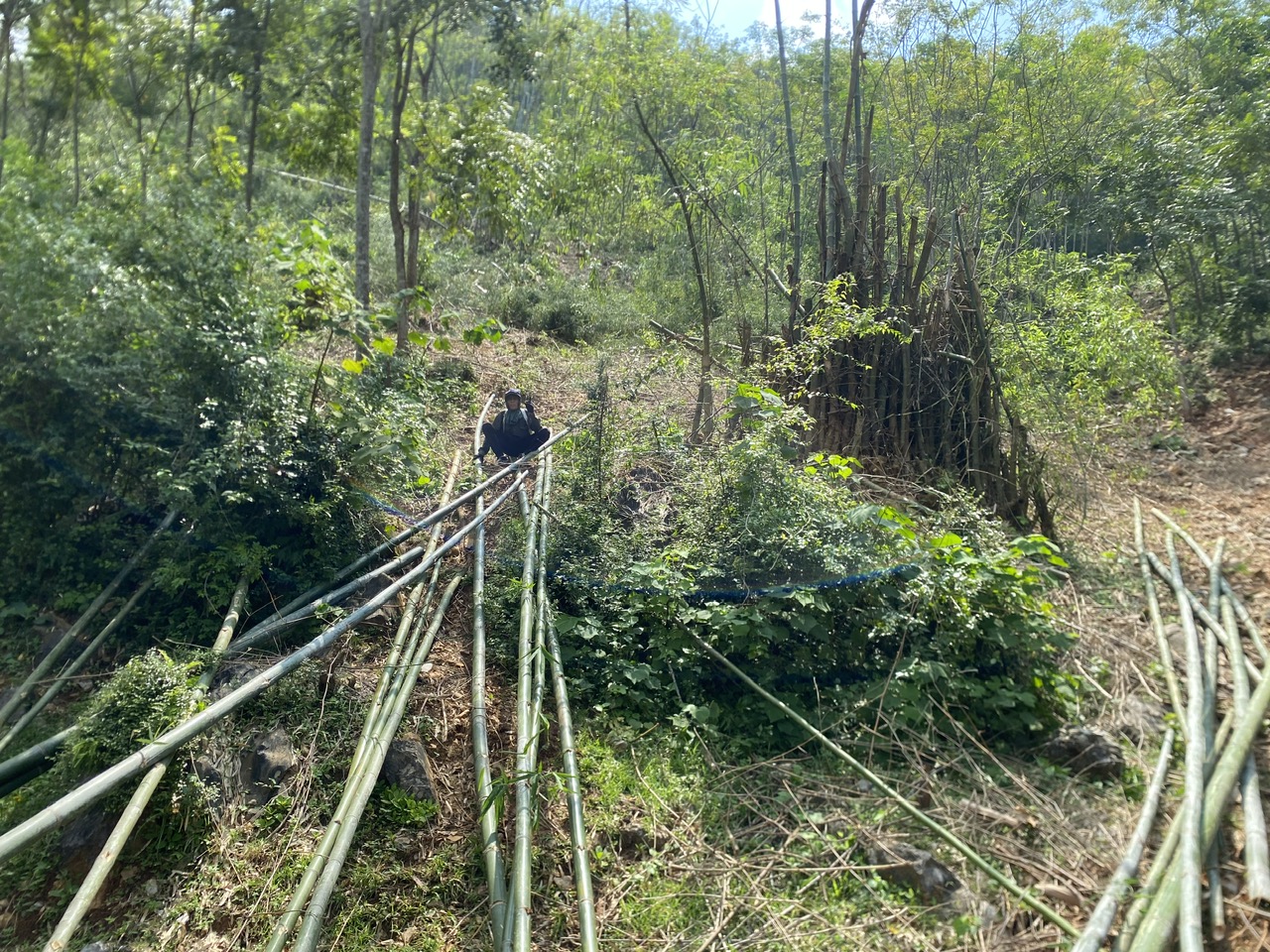 Bước 1: Nhân công sẽ cắt tre tại các đồi và vận chuyển xuống tới chân núi.
